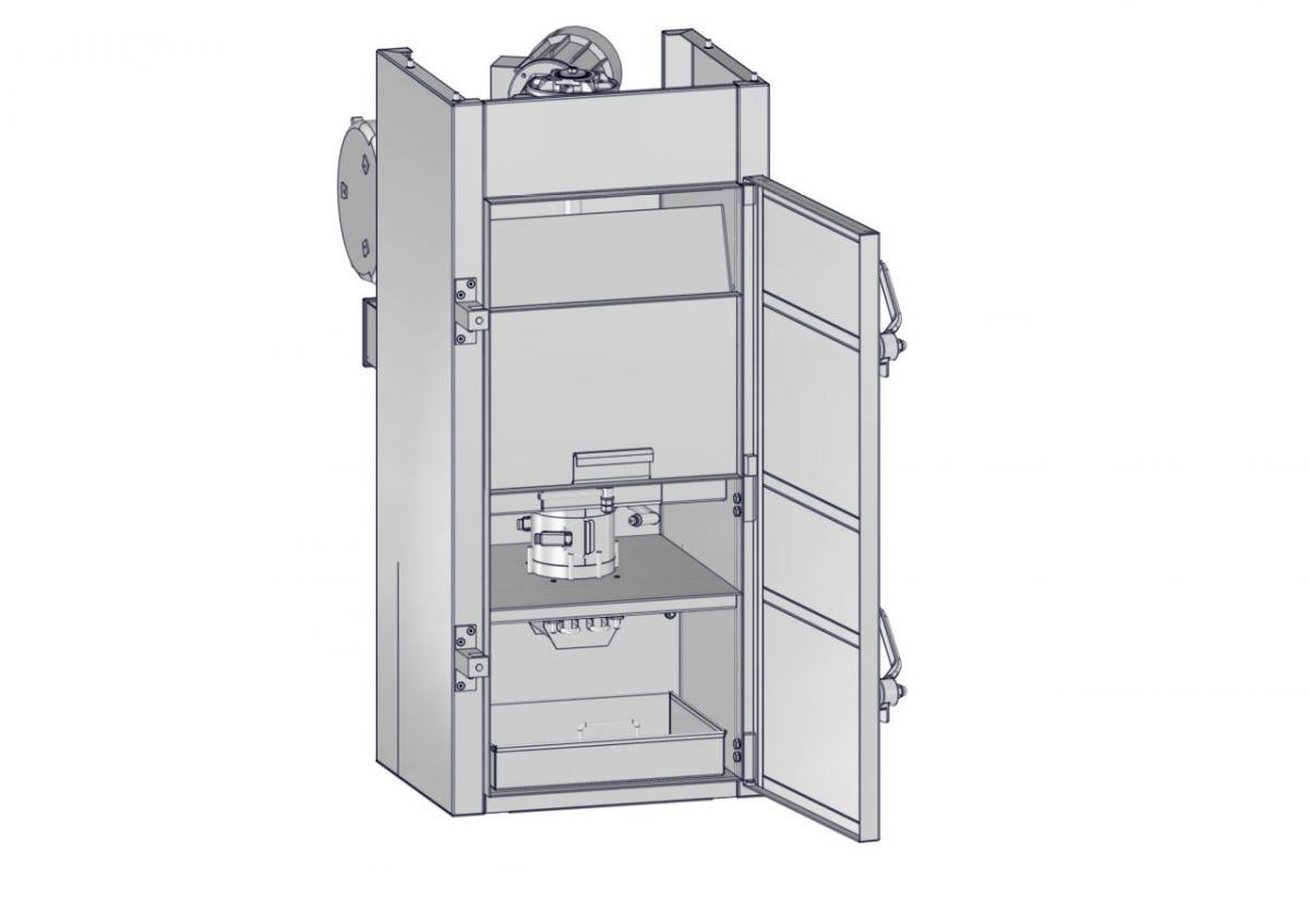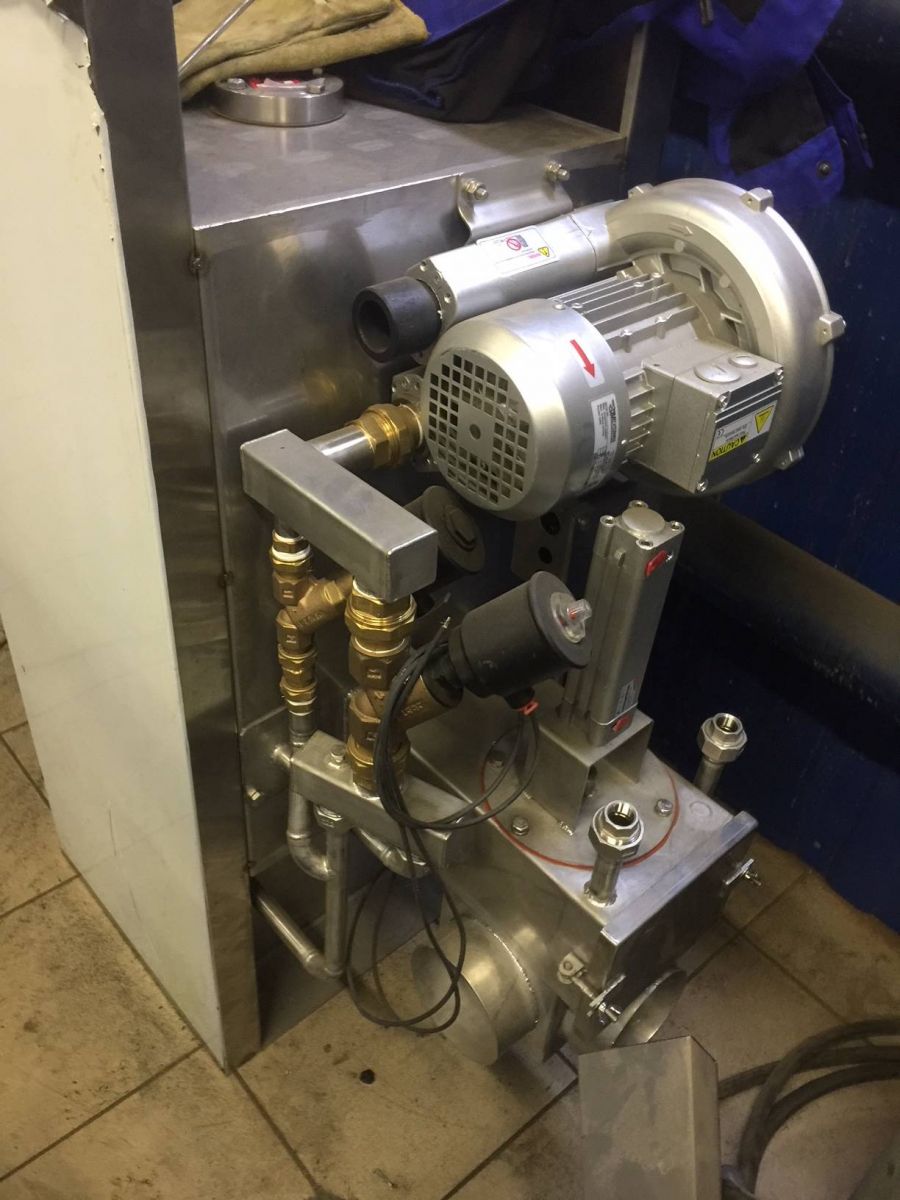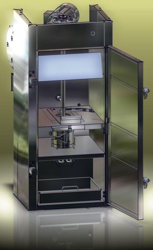Дымогенератор для 1-2х рамной термокамеры. Принцип работы основан на тлении щепы твердых пород дерева. Управляется автоматически. Дымогенератор оборудован системой датчиков, следящих за объемом щепы в загрузочном бункере, температурным режимом в камере тления и температурой образовавшегося дыма. Имеется так же система пневмоклапанов, регулирующих подачу воздуха. При превышении каких-либо максимальных величин заданных параметров значений температур, дымогенератор автоматически, по команде с пульта управления, гасит тление щепы путем прекращения подачи воздуха в камеру тления на определенное время или же впрыском воды.