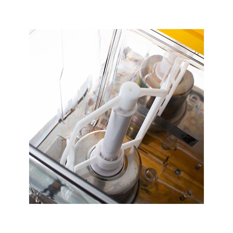 Предназначенные для напитков стеклянные ёмкости закрываются пластмассовыми крышками. Они, как и фигурные краники, привлекают дополнительное внимание к сокоохладителю.