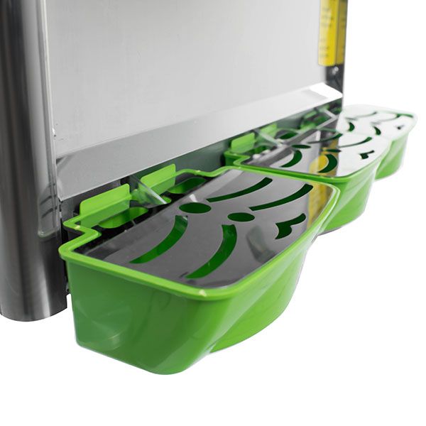 Предназначенные для напитков стеклянные ёмкости закрываются пластмассовыми крышками. Они, как и фигурные краники, привлекают дополнительное внимание к сокоохладителю.