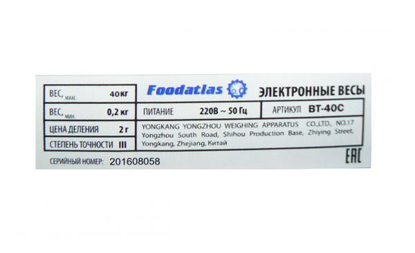 Торговые весы Foodatlas 40кг/2гр ВТ-40С